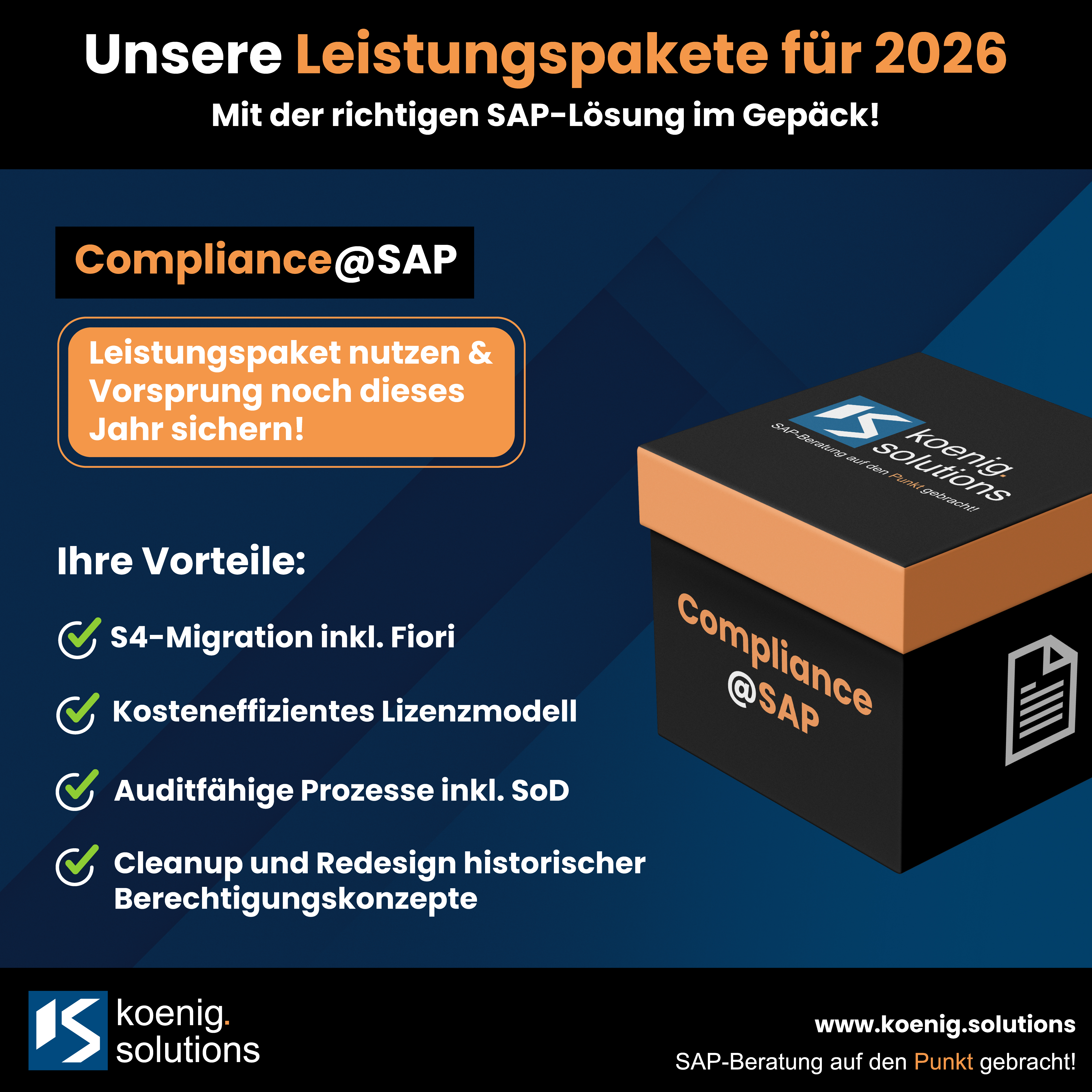 Wir helfen Ihnen, auditfähige Prozesse zu implementieren, historische Berechtigungskonzepte zu bereinigen und effizient neu zu gestalten und dabei ein kosteneffizientes Lizenzmodell zu nutzen. So stellen Sie sicher, dass Compliance-Anforderungen zuverlässig erfüllt werden und Ihre SAP-Landschaft zukunftssicher aufgestellt ist. Jetzt noch vor dem Jahreswechsel informieren, zugreifen und optimal gerüstet ins neue Geschäftsjahr starten! Wir stehen mit unseren Leistungspaketen bereit! Kontaktieren Sie uns!