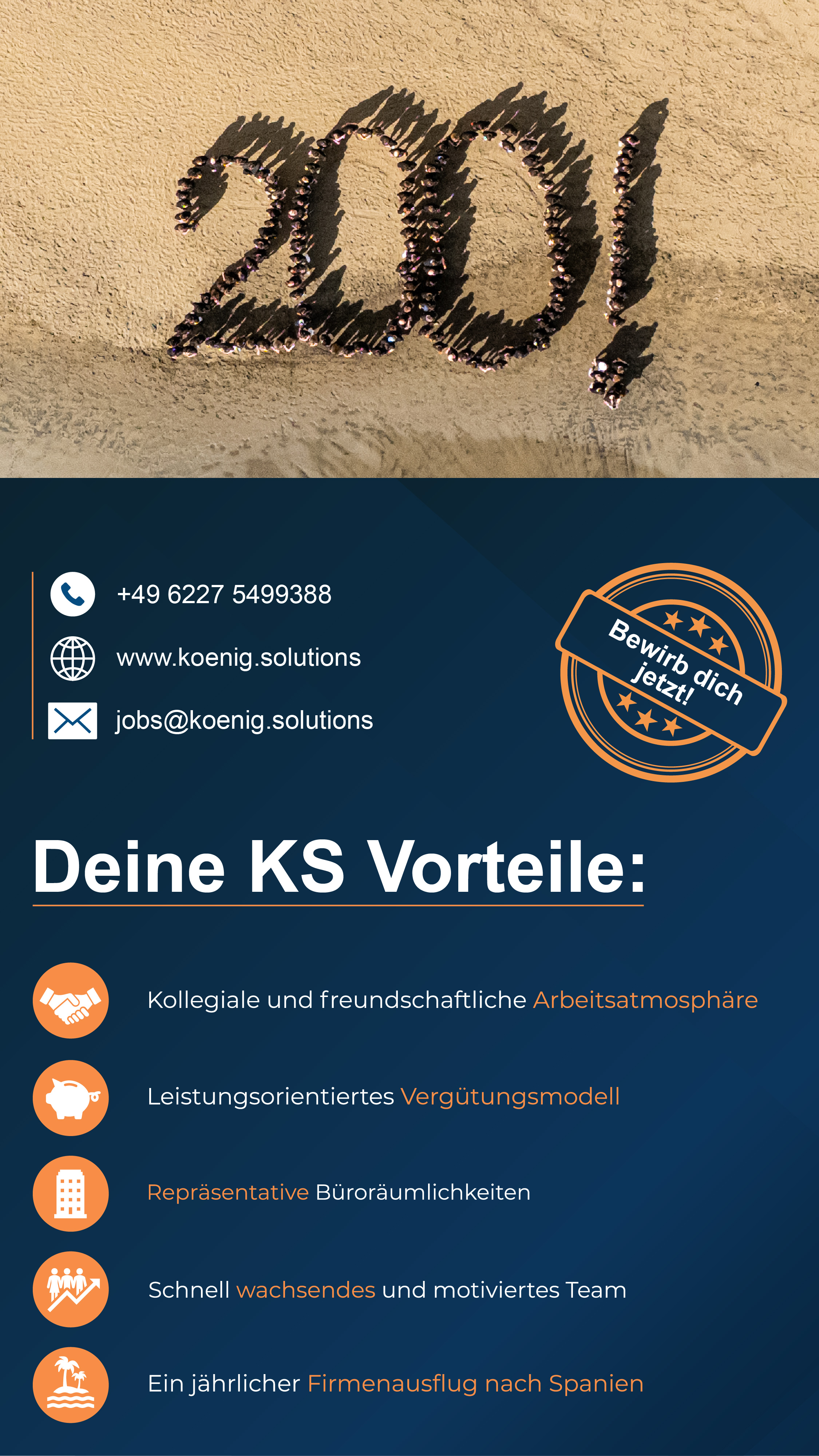Entdecke die Vorteile, die Dich bei koenig.solutions erwarten – von einem leistungsorientierten Vergütungsmodell und vielfältigen Entwicklungsmöglichkeiten bis hin zu einem kollegialen Arbeitsumfeld und regelmäßigen Team-Events. Werde Teil unseres dynamischen Teams und erlebe, warum koenig.solutions mehr ist als nur ein Arbeitsplatz!