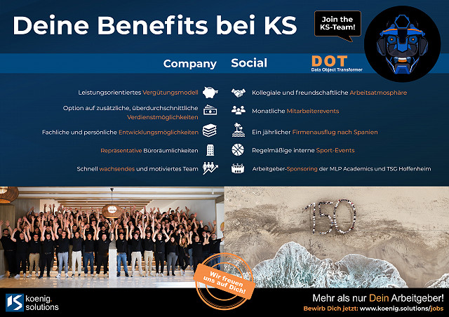 Entdecke die Vorteile, die Dich bei koenig.solutions erwarten – von einem leistungsorientierten Vergütungsmodell und vielfältigen Entwicklungsmöglichkeiten bis hin zu einem kollegialen Arbeitsumfeld und regelmäßigen Team-Events. Werde Teil unseres dynamischen Teams und erlebe, warum koenig.solutions mehr ist als nur ein Arbeitsplatz!